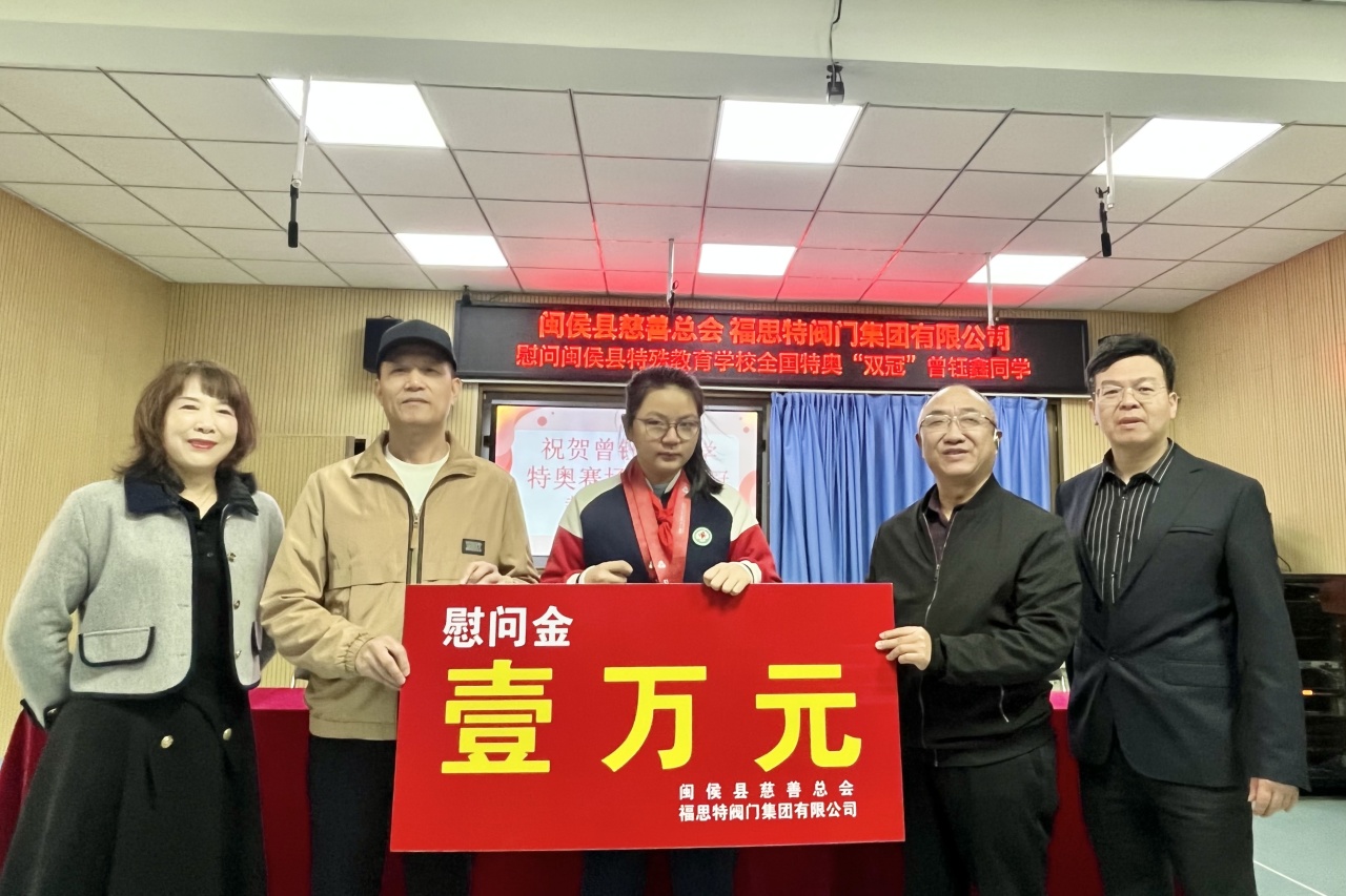 为表扬其卓越成绩,传递社会关爱,12月17日,闽侯县慈善总会会同福思特阀门集团有限公司赴闽侯县特殊教育学校慰问曾钰鑫同学,为她送去真诚祝福和1万元的慰问金。